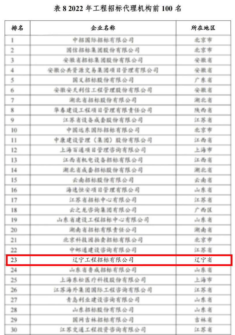 2023年8月,中国土木工程学会建筑市场与招标投标研究分会组织编写了《2022年度工程招标代理行业发展报告》,报告公布的2022年工程招标代理机构百强名单中,心博app官方版下载作为辽宁省唯一入选代理机构,荣获全国第23名。